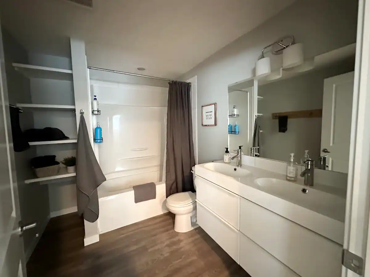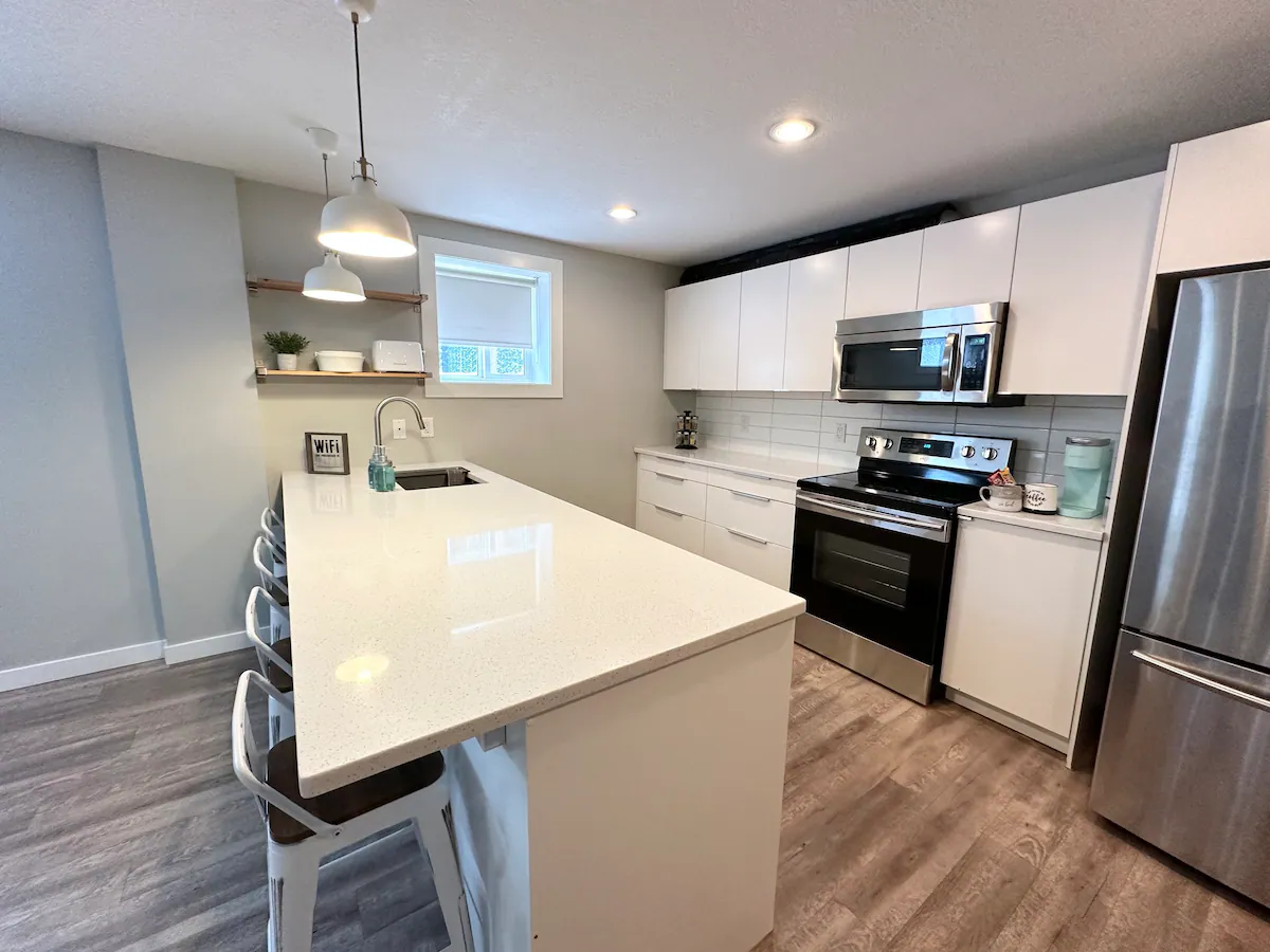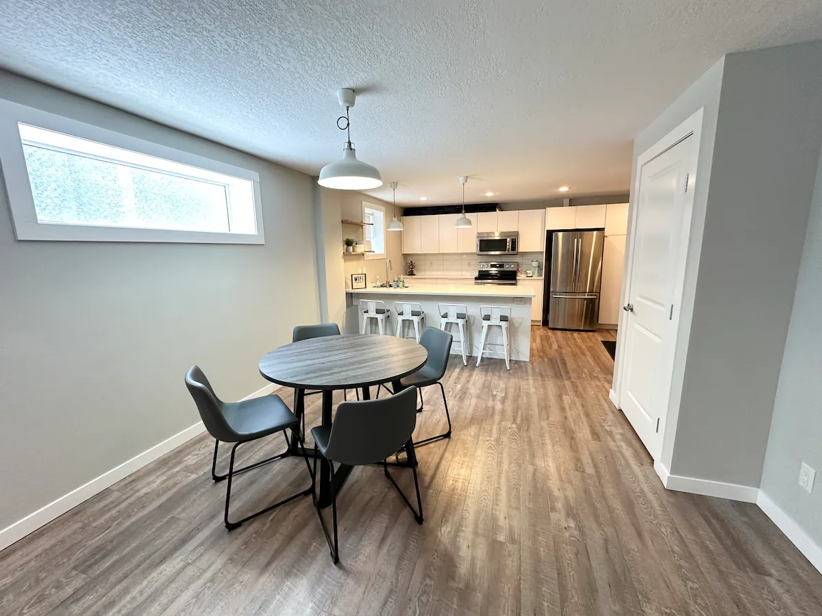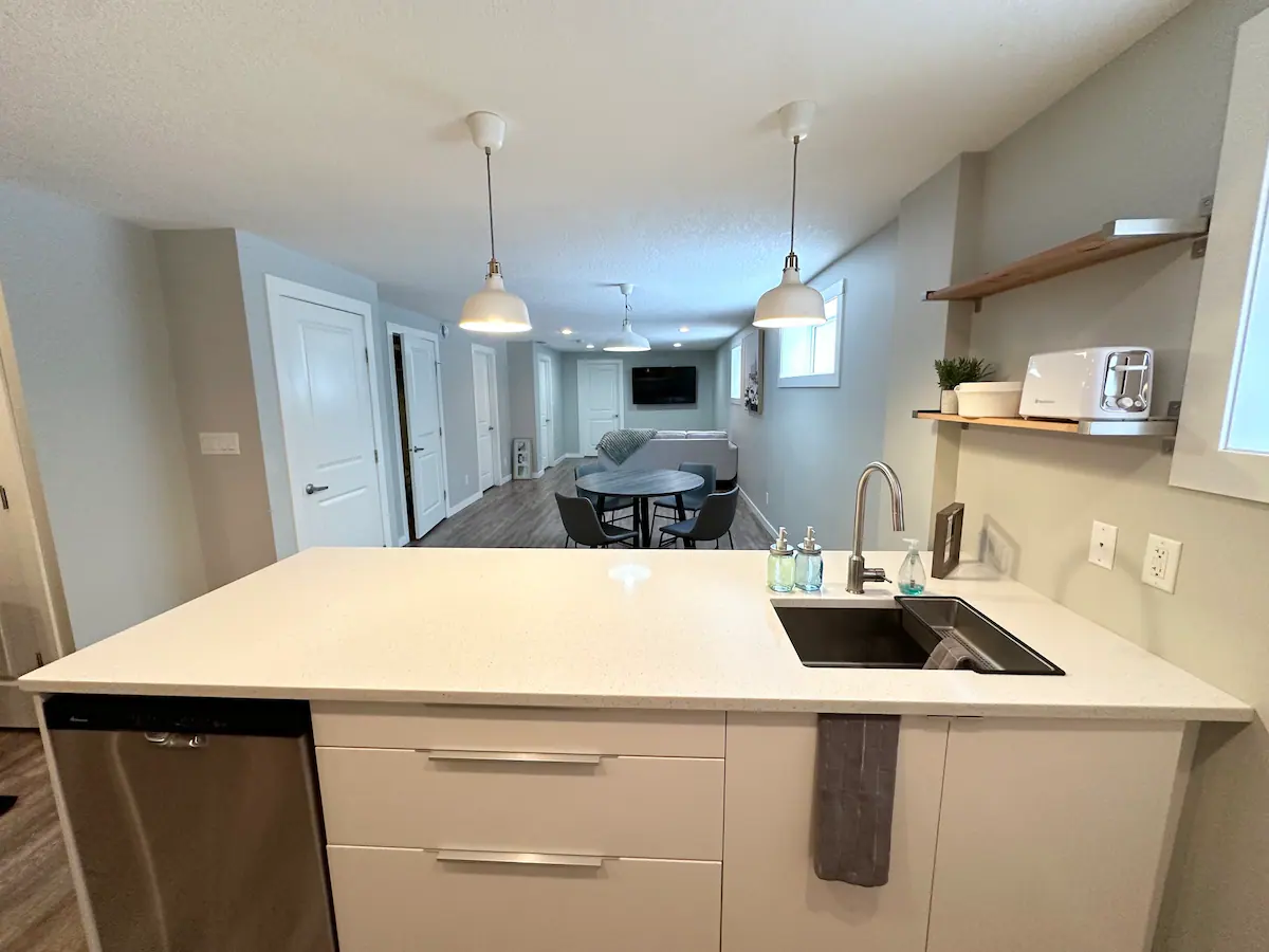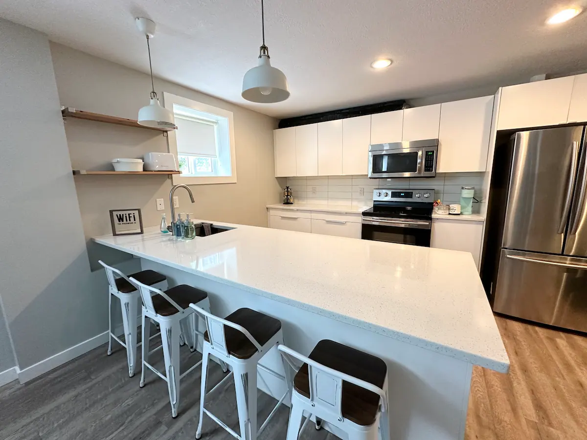 A large kitchen with lots of seating, dining area, and living room with 55” TV. Bathroom with double sinks and 2 bedrooms.
